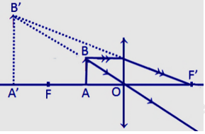 Vật AB đặt trước thấu kính hội tụ có tiêu cự f và cách thấu kính một khoảng \(OA = \dfrac{f}{2}\) cho ảnh A'B'. Ảnh A'B' có đặc điểm