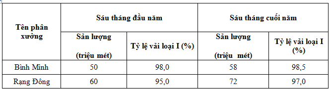 Có số liệu về tình hình sản xuất năm 2020 của hai phân xưởng thuộc một công ty dệt số liệu cho trong bảng sau: