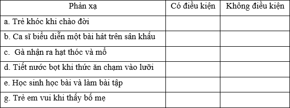 Hãy cho biết mỗi phản xạ được nêu trong bảng dưới đây là phản xạ có điều kiện hay