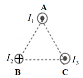 Ba dòng điện thẳng song song vuông góc với mặt phẳng hình vẽ có chiều như hình vẽ. Tam giác