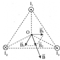 Ba dòng điện thẳng song song vuông góc với mặt phẳng hình vẽ có chiều như hình vẽ. Tam giác ABC đều. biết \({{I}_{1}}~={{I}_{2}}~={{I}_{3}}~=10A\), cạnh của tam giác bằng \(10cm\). Cảm ứng từ tại tâm \(O\) của tam giác bằng: