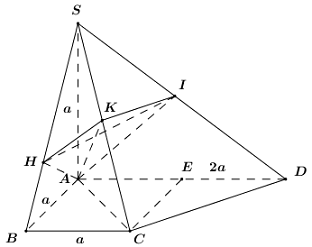 Cho hình chóp tứ giác \(S.ABCD\) có đáy \(ABCD\) là hình thang vuông tại \(A\) và \(B\). Biết \(AB = BC = a\) và \(AD = 2a\). Đường thẳng \(SA\) vuông góc với mặt phẳng \(\left( {ABCD} \right)\), \(SA = a\). Kẻ \(AH \bot SB\) và \(AK \bot SC\)\(\left( {H \in SB,\,\,K \in SC} \right)\).