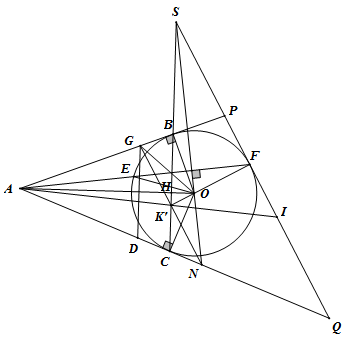 4. Đường thẳng \(SF\) cắt các đường thẳng \(AB\) và \(AC\) tương ứng tại \(P\) và \(Q.\) Đường thẳng \(OF\) cắt \(BC\) tại \(K.\) Chứng minh rằng \(AK\) đi qua trung điểm của \(PQ\)?