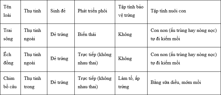 Sự sinh sản hữu tính (thụ tinh, phát triển phôi) và tập tính chăm sóc con (bảo vệ trứng, nuôi con) ở các loài trai sông, ếch đồng, chim bồ câu được thể hiện như thế nào?