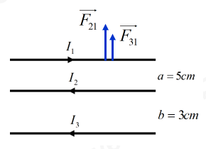 Có 3 dòng điện thẳng song song \({I_1},{I_2}\;\) và \({I_3}\) ở trong cùng một mặt phẳng, cho \({I_1}\; = 20A;{I_2}\; = 15A;{I_3}\; = 25A\). Khoảng cách giữa \({I_1},{I_2}\;\) là \(a = 5cm\), giữa \({I_2}\) và \({I_3}\) là \(b = 3cm\). Lực tác dụng lên \(1m\) chiều dài của \({I_1}\) là: