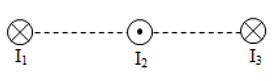 Ba dây dẫn thẳng dài mang dòng điện \({I_1},{I_2},{I_3}\;\) theo thứ tự đó, đặt song song cách