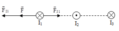 Ba dây dẫn thẳng dài mang dòng điện \({I_1},{I_2},{I_3}\;\) theo thứ tự đó, đặt song song cách đều nhau, khoảng cách giữa 2 dây là \(a = 4cm\). Biết rằng chiều của \({I_1}\) và \({I_3}\) hướng vào, \({I_2}\) hướng ra mặt phẳng hình vẽ, cường độ dòng điện \({I_1}\; = 10A;{I_2}\; = {I_3}\; = 20A\) . Xác định lực từ tác dụng lên 1 mét của dòng \({I_1}\).