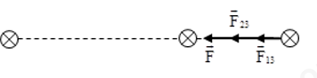 Ba dòng điện cùng chiều cùng cường độ \(10A\) chạy qua ba dây dẫn thẳng đặt đồng phẳng và dài vô hạn. Biết rằng khoảng cách giữa dây 1 và 2 là \(10cm\) dây 2 và 3 là \(5cm\) và dây 1 và 3 là \(15cm\). Xác định lực từ do dây 1 và dây 2 tác dụng lên dây 3:
