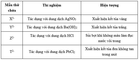 Tiến hành thí nghiệm với các dung dịch muối riêng biệt của các cation: X3-, Y2-, Z2-, T2-. Kết quả ghi được ở bảng sau: