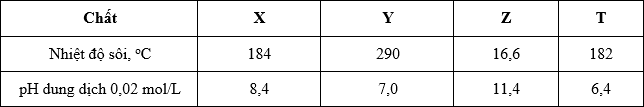 Các chất: etylamin, phenol, anilin, glixerol được kí hiệu ngẫu nhiên là X, Y, Z, T. Một số tính chất được ghi trong bảng sau: