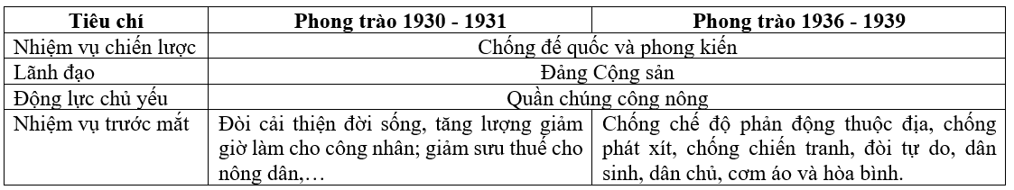 Dựa vào các tiêu chí nhiệm vụ chiến lược, nhiệm vụ trước mắt, lãnh đạo và động lực cách mạng của phong trào 1930 – 1931 và 1936 – 1939 để so sánh và rút ra điểm khác biệt.