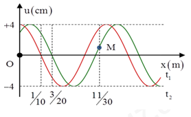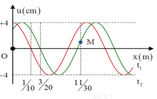 Một sóng hình sin đang truyền trên một sợi dây theo chiều dương của trục \(Ox\). Hình vẽ mô tả hình dạng của sợi dây tại thời điểm \({t_1}\) và \({t_2}\; = {t_1}\; + 1s\). Tại thời điểm \({t_2}\), vận tốc của điểm M trên dây gần giá trị nào nhất sau đây?
