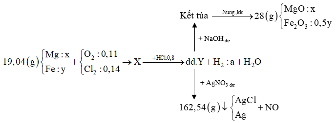 Đốt cháy 19,04 gam hỗn hợp gồm Mg và Fe trong 5,6 lít (đktc) hỗn hợp khí gồm O2 và Cl2, thu được 32,50 gam rắn X (không thấy khí thoát ra). Cho toàn bộ X vào dung dịch chứa 0,8 mol HCl loãng, thu được a mol khí H2 và dung dịch Y. Cho dung dịch NaOH dư vào Y, lấy kết tủa, nung ngoài không khí đến khối lượng không đổi, thu được 28,0 gam rắn khan. Nếu cho dung dịch AgNO3 dư vào Y, thu được khí NO (sản phẩm khử duy nhất của N+5) và 162,54 gam kết tủa. Giá trị của a là