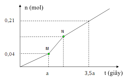 Hòa tan hoàn toàn m gam hỗn hợp CuSO4 và NaCl vào nước, thu được dung dịch X. Tiến hành điện phân X với các điện cực trơ, màng ngăn xốp, dòng điện có cường độ không đổi. Tổng số mol khí thu được trên cả hai điện cực (n) phụ thuộc vào thời gian điện phân (t) được mô tả như đồ thị bên (đồ thị gấp khúc tại các điểm M, N). Giả sử hiệu suất điện phân là 100% bỏ qua sự bay hơi của nước. Giá trị của m là