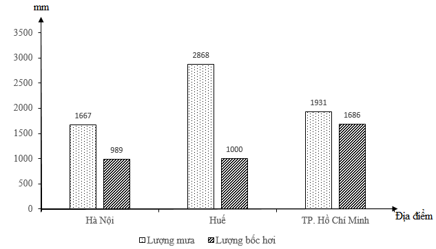 Cho biểu đồ BIỂU ĐỒ THỂ HIỆN LƯỢNG MƯA, LƯỢNG BỐC HƠI MỘT SỐ ĐỊA ĐIỂM Ở NƯỚC