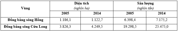 Theo bảng trên, nhận xét nào sau đây không đúng về tình hình sản xuất lúa của Đồng bằng sông Hồng và Đồng bằng sông Cửu Long năm 2005 và năm 2014?