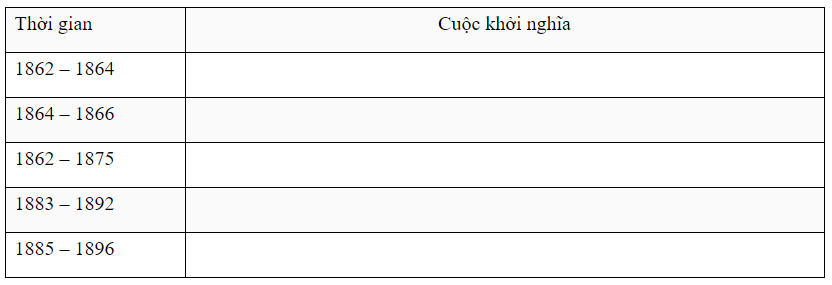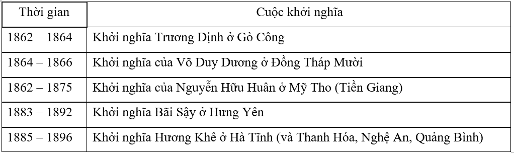 Dựa vào nội dung cuộc kháng chiến chống Pháp của nhân dân Nam Kì sau Hiệp ước 1862 (SGK Lịch sử 11, trang 112 – 114) cho đến phong trào Cần vương cuối thế kỉ XIX (SGK Lịch sử 11, trang 128, 131) để hoàn thành bảng.