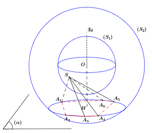 Cho hai khối cầu đồng tâm có bán kính là 1 và 4. Xét hình chóp \(S.{A_1}{A_2}{A_3}{A_4}{A_5}{A_6}\) có