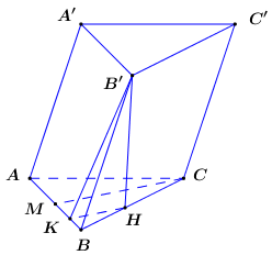 - Gọi \(M\) là trung điểm của \(AB\), trong \(\left( {ABC} \right)\) kẻ \(HK//CM\,\,\left( {K \in AB} \right)\), tính \(B'K\) theo \(x\), từ đó tính \({S_{ABB'A'}}\) theo \(x\).