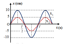 Có hai con lắc lò xo giống nhau đều có khối lượng vật nhỏ là \(m = 400g\), cùng độ cứng của lò xo là \(k\). Mốc thế năng tại vị trí cân bằng O. Cho đồ thị li độ \({x_1},{x_2}\) theo thời gian của con lắc thứ nhất và con lắc thứ hai như hình vẽ. Tại thời điểm \(t\) con lắc thứ nhất có động năng \(0,06J\) và con lắc thứ hai có thế năng \(0,005J\). Chu kì của hai con lắc có giá trị là: