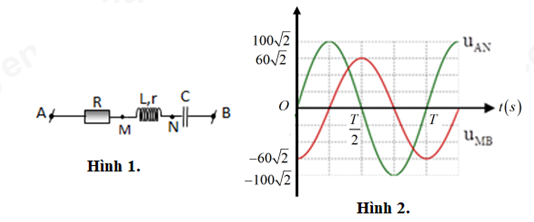 Đặt điện áp xoay chiều \(u = {U_0}\cos \left( {\dfrac{{2\pi }}{T} + \varphi } \right)\left( V \right)\) vào hai đầu đoạn mạch AB như hình vẽ 1. Biết \(R = r = 30\Omega \). Đồ thị biểu diễn điện áp \({u_{AN}}\) và \({u_{MB}}\) theo thời gian như hình vẽ 2. Công suất của mạch AB có giá trị gần đúng là: