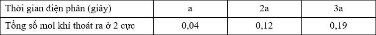 Hòa tan hoàn toàn m gam hỗn hợp CuSO4 và NaCl vào nước, thu được dung dịch X. Tiến hành điện phân X với các điện cực trơ, màng ngăn xốp, dòng điện có cường độ không đổi. Kết quả thí nghiệm cho ở bảng sau: