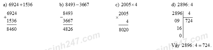 Đặt tính rồi tính: a) \(6924 + 1536\) b) \(8493 -