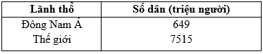 Cho bảng số liệu sau: Dân số Đông Nam Á và Thế giới năm 2017