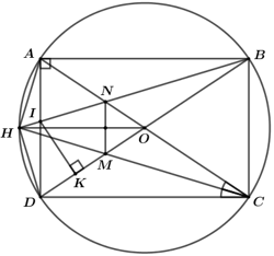 2) Dây \(HC\) của \(\left( O \right)\) cắt \(BD\) tại \(M\), dây \(HB\) của \(\left( O \right)\) cắt \(AC\) tại \(N\). Chứng minh: Tứ giác\(MNBC\) nội tiếp và \(MN \bot OH\).