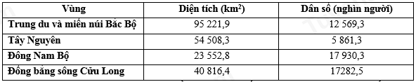 Cho bảng số liệu: DIỆN TÍCH VÀ DÂN SỐ MỘT SỐ VÙNG NƯỚC TA, NĂM 2019 (Nguồn: Niên giám