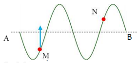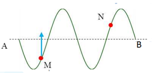 Một sóng truyền theo phương AB. Tại một thời điểm nào đó, hình dạng sóng có dạng như hình vẽ. Biết rằng điểm M đang đi lên vị trí cân bằng. Khi đó, điểm N đang chuyển động như thế nào?