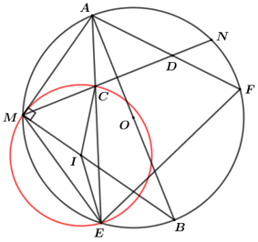 Cho \(\left( {O;\,\,R} \right)\), \(MN\) là dây không đi qua tâm. \(C,\,\,D\) là hai điểm bất kì thuộc dây \(MN\) (\(C,\,\,D\) không trùng với \(M,\,\,N\)). \(A\) là điểm chính giữa của cung nhỏ \(MN\). Các đường thẳng \(AC\) và \(AD\) lần lượt cắt \(\left( O \right)\) tại điểm thứ hai là \(E,\,\,F\).