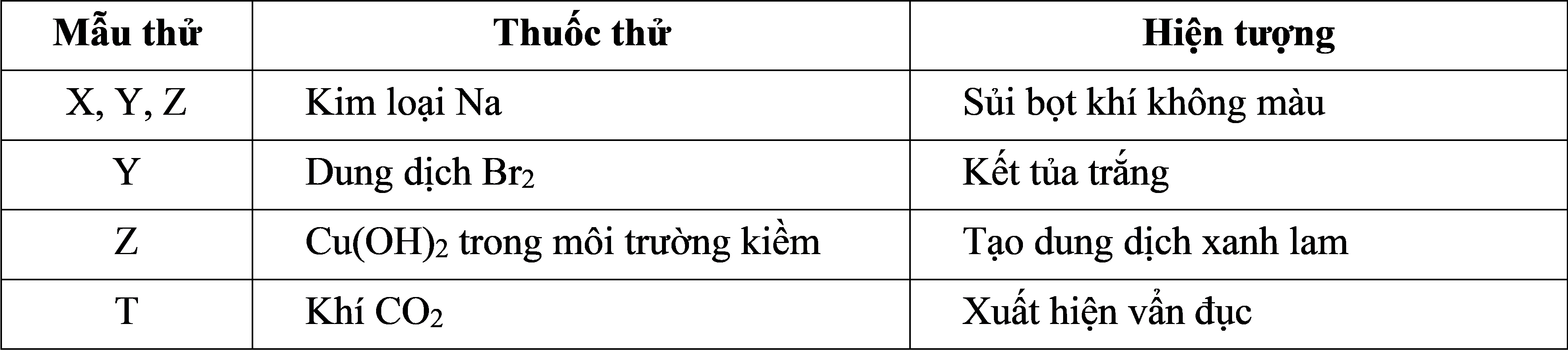 Kết quả thí nghiệm của các chất X, Y, Z, T với một số thuốc thử được ghi ở bảng