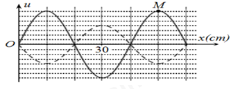 Một sợi dây đàn hồi AB căng ngang hai đầu cố định đang có sóng dừng ổn định. Ở thời điểm \({t_0}\) , điểm M trên dây đang có tốc độ bằng 0, hình dạng sợi dây có đường nét liền như hình bên. Kể từ thời điểm \({t_0}\), sau khoảng thời gian ngắn nhất bằng \(\dfrac{1}{3}s\) hình dạng sợi dây có đường nét đứt. Tốc độ truyền sóng trên dây là