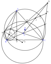 b) Gọi \(M\) là giao điểm của đường thẳng \(EF\) với \(\left( O \right)\) (\(M\) thuộc cung nhỏ \(AB\)). \({O_1},{O_2}\)lần lượt là tâm đường tròn ngoại tiếp các tam giác \(BMF\) và \(CME\). Chứng minh rằng: \({O_1}{O_2} \bot AM.\)