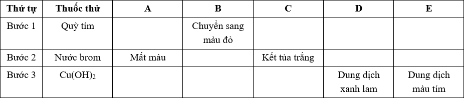 Có 5 dung dịch A, B, C, D, E, mỗi dung dịch chứa một trong các chất tan sau: glucozơ; saccarozơ, anilin, axit glutamic; Ala-Gly-Val. Để xác định chất tan trong các dung dịch, tiến hành các bước thí nghiệm mô tả bằng bảng sau: