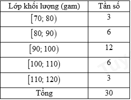 Khối lượng của \(30\) củ khoai tây thu hoạch ở một nông trường được cho ở bảng sau. Hãy chọn đáp án đúng.