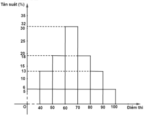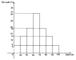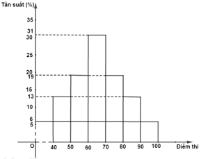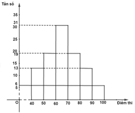 Khi đó, biểu đồ tần suất hình cột để mô tả bảng phân bố tần suất ghép lớp với các lớp \(\left[ {40;\,\,50} \right);\,\,\left[ {50;\,\,60} \right);\,\,\left[ {60;\,\,70} \right);\left[ {70;\,\,80} \right);\,\,\left[ {80;\,\,90} \right);\,\,\left[ {90;\,\,100} \right)\) là