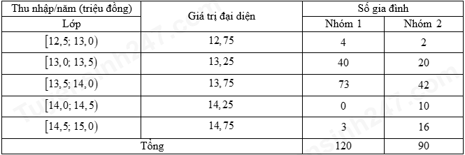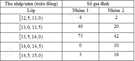 Thu nhập gia đình/năm của hai nhóm dân cư ở hai xã của một huyện được cho trong bảng