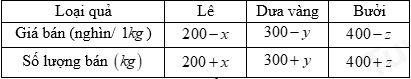 Một cửa hàng bán \(3\) loại hoa quả nhập khẩu: Bưởi, Dưa vàng và Lê. Sau khi giảm giá mỗi loại lần lượt là \(x,\,\,y,\,\,z\) trên \(1kg\) thì số liệu tính toán được ghi lại bởi sau: