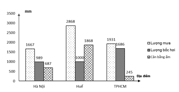 Cho biểu đồ: CHO BIỂU ĐỒ LƯỢNG MƯA, LƯỢNG BỐC HƠI, CÂN BẰNG ẨM CỦA MỘT SỐ ĐỊA