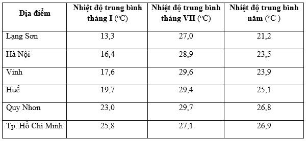 Cho bảng số liệu: NHIỆT ĐỘ TRUNG BÌNH TẠI MỘT SỐ ĐỊA ĐIỂM Theo bảng số liệu trên,
