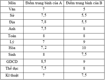 Kết quả học tập của hai học sinh A và B như sau: Nhận xét nào sau đây là