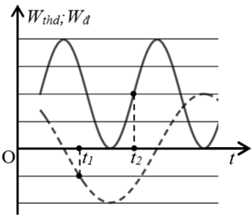 Một con lắc lò xo treo thẳng đứng dao động điều hòa tại nơi có \(g = 10m/{s^2}\). Bỏ qua mọi lực cản. Chọn mốc thế năng tại vị trí cân bằng của quả nặng. Hình vẽ bên là một phần các đường cong biểu diễn mối liên hệ giữa thế năng trọng trường và động năng của quả nặng theo thời gian. Biết \({t_2} - {t_1} = \dfrac{{7\pi }}{{240}}s\). Xét một chu kì, trong thời gian lò xo bị nén thì tốc độ trung bình của quả nặng gần nhất với giá trị nào sau đây?