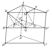 Cho hình lăng trụ tam giác \(ABC.A'B'C'\) có diện tích đáy bằng \(12\) và chiều cao bằng \(6\). Gọi \(M,\;N\) lần lượt là trung điểm của \(CB,\;CA\) và \(P,\;Q,\;R\) lần lượt là tâm các hình bình hành \(ABB'A'\), \(BCC'B'\), \(CAA'C'\). Thể tích của khối đa diện \(PQRABMN\) bằng:
