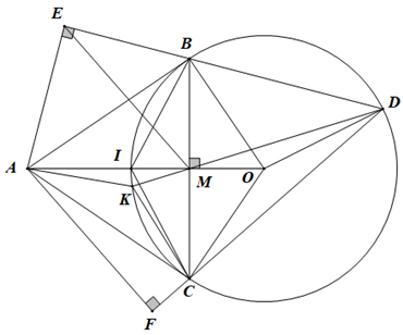 2) Gọi \(D\) là điểm thuộc cung lớn \(BC\) của đường tròn \(\left( O \right),\,\,\left( {BD < DC} \right)\) và \(K\) là giao điểm thứ hai của tia \(DM\) với đườn tròn \(\left( O \right).\) Chứng minh rằng: \(MD.MK = MA.MO.\)