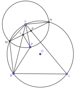 Cho tam giác \(ABC\,\left( {AB \le AC} \right)\), lấy điểm \(P\) nằm trong tam giác sao cho \(AP < AB\) . Đường tròn tâm \(A\), bán kính \(AP\) cắt đường tròn ngoại tiếp tam giác \(ABC\) tại hai điểm phân biệt \(M,N\)