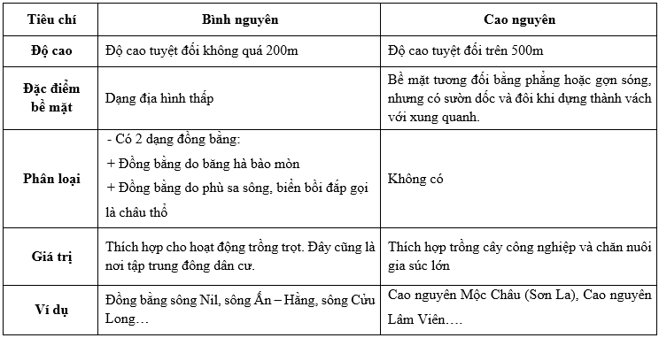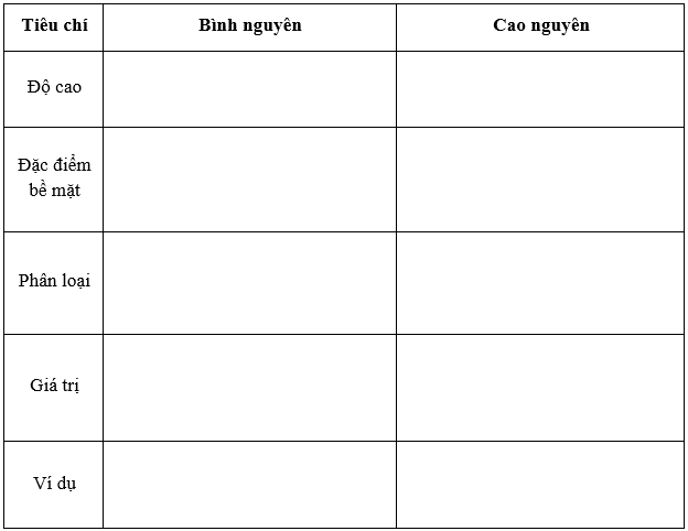 Hoàn thành bảng so sánh địa hình bình nguyên và cao nguyên: