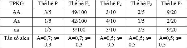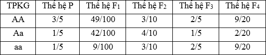 Một loài thực vật, xét 1 gen có 2 alen, alen A trội hoàn toàn so với alen a. Nghiên cứu thành phần kiểu gen (TPKG) của một quần thể thuộc loài này qua các thế hệ, thu được kết quả ở bảng sau: