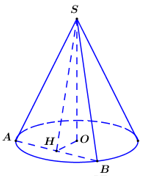 - Giả sử một mặt phẳng đi qua đỉnh của hình nón và cắt hình nón theo một thiết diện là tam giác đều \(SAB\) như hình vẽ. Gọi \(O\) là tâm mặt đáy của hình nón và \(H\) là trung điểm của \(AB\), khi đó ta có \(OH \bot AB\).